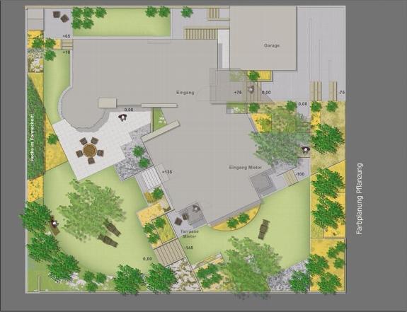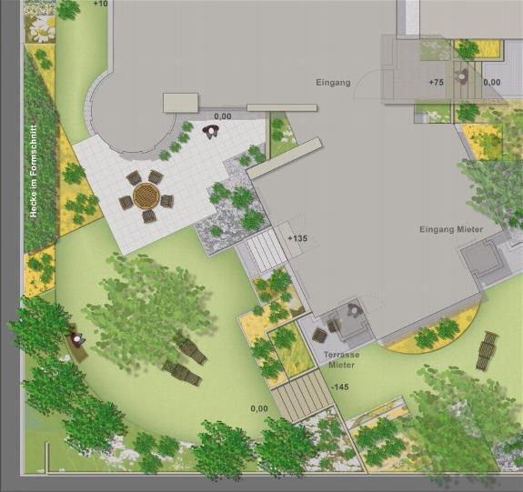 Die optische Verschmelzung von zwei getrennten Gartenzonen (Haupt- und Mietergarten)